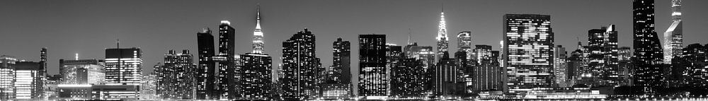Dieses Schwarz-Weiß-Foto zeigt einen atemberaubenden Panoramablick auf die nächtliche Skyline von New York City. Die Skyline ist voll von zahlreichen Hochhäusern und ikonischen Wolkenkratzern, darunter das Empire State Building und das Chrysler Building, die beide deutlich zu erkennen sind.