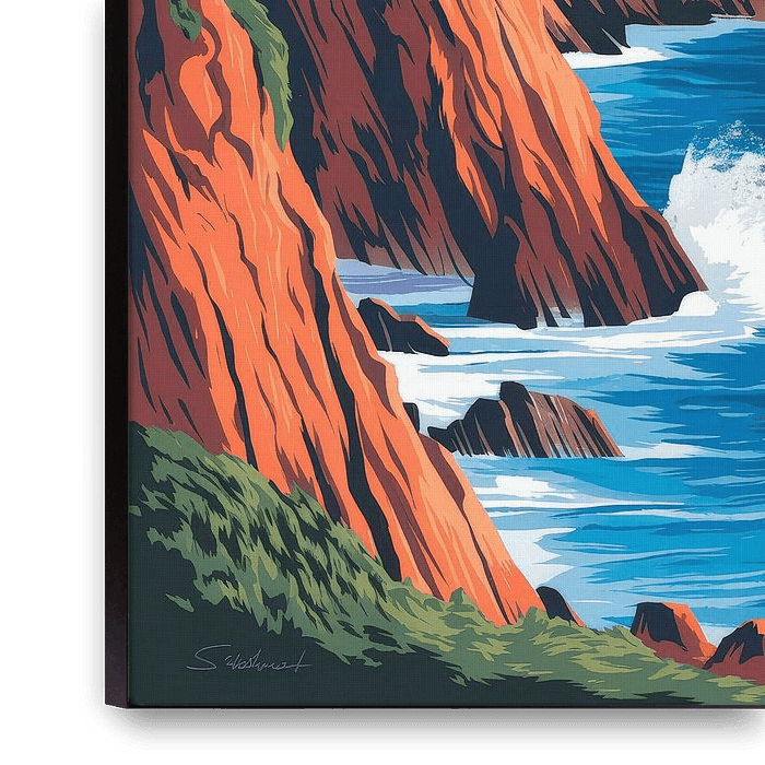 Ein atemberaubender Blick auf felsige Klippen, deren Erdtöne mit dem tiefblauen Meer kontrastieren, während die Wellen rhythmisch gegen die Küste schlagen. Im Hintergrund erheben sich elegante Gebäude unter einem strahlend blauen Himmel. Dieses Kunstwerk bringt das Gefühl von Freiheit und Natur ins Wohnzimmer und lädt zu entspannenden…