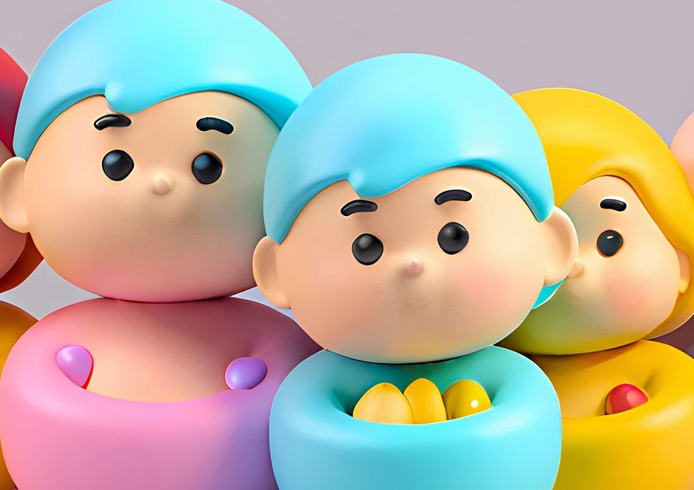 Fünf Zeichentrickfiguren, jede mit einem eigenen Farbschema, sind in einer Reihe vor einem hellgrauen Hintergrund angeordnet. Sie sind alle in einem 3D-Stil dargestellt, mit abgerundeten Gesichtszügen und großen, ausdrucksstarken Augen. Die Figuren tragen farbenfrohe Outfits und halten Gegenstände in ihren Händen. Die Gesamtstimmung des Bildes ist spielerisch und fröhlich, mit einem Schwerpunkt auf hellen Farben und skurrilen Designs.