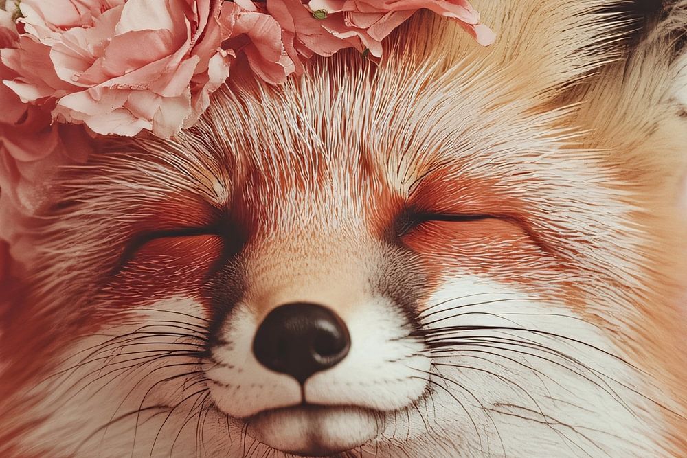 Dieses bezaubernde Bild zeigt einen lächelnden Fuchs, der mit einem Blumenkranz geschmückt ist und einen friedlichen und fröhlichen Eindruck macht. Die zarten Rosatöne der Blumen harmonieren perfekt mit den warmen Farben des Fuchses und vermitteln ein Gefühl von Ruhe und Verspieltheit. Dieses Motiv ist perfekt für alle, die die Natur und die Schönheit von Tieren mit einem Hauch von Romantik lieben. Es passt zu einer Vielzahl von Einrichtungsstilen, von klassisch bis modern, und zaubert garantiert ein Lächeln in jeden Raum, in dem es angebracht wird. Ideal für Schlafzimmer oder Büros, um eine warme, einladende Atmosphäre zu schaffen.