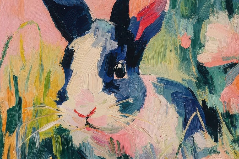 Ein niedlicher Hase sitzt im Garten zwischen Blumen und Wildblumen, umgeben von zarten Rosa- und Blautönen. Dieses impressionistische Ölgemälde besticht durch weiche Pinselstriche, Pastellfarben und einen sanften Vintage-Stil. Die harmonische Komposition aus Licht, Farbe und Details vermittelt eine friedliche, verträumte Atmosphäre und fängt die zarte Schönheit des Gartens ein. Ein charmantes Kunstwerk, das Natur, Ruhe und spielerische Leichtigkeit in perfekter Balance vereint.