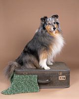 Niedlicher australischer Schäferhund sitzt auf einem Koffer