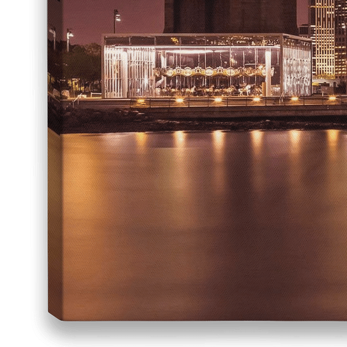 Skyline des südlichen Teils von New York City mit der Brooklyn Bridge im Vordergrund. Die Lichter der Metropole spiegeln sich im East River.