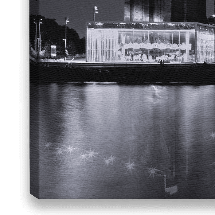Skyline des südlichen Teils von New York City mit der Brooklyn Bridge im Vordergrund. Dekoratives Stadtpanorama bei Nacht mit einer Spiegelung der Brücke und Hochhäuser im Wasser.