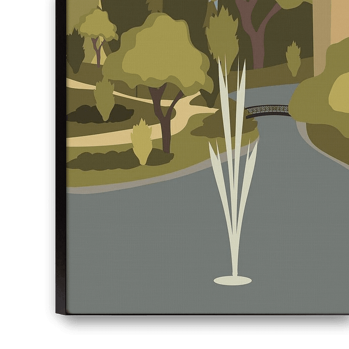 Warten Sie nicht länger! Holen Sie sich dieses wunderschöne Kunstwerk noch heute nach Hause und lassen Sie sich von der zeitlosen Schönheit des Kronenburg-Parks verzaubern, die ein talentierter Künstler mit einer Leidenschaft für Geschichte und Natur auf Leinwand gebannt hat.