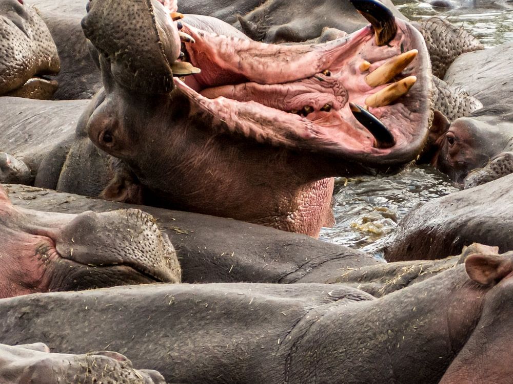 Nilpferdbecken mit offenem Maul in einem Nilpferdbecken in der Serengeti, Tansania - Afrika
