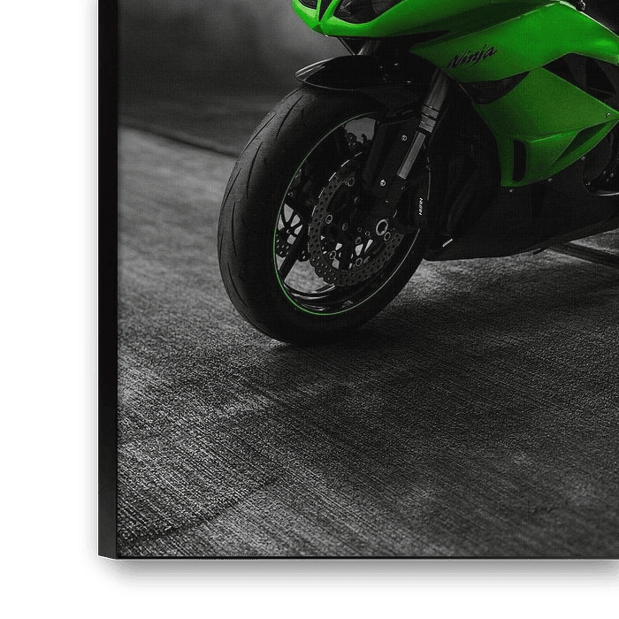 Neongrüner Geschwindigkeitsdämon. Die Kawasaki Ninja, gehüllt in Nebel und Schatten. Ihr leuchtend grüner Körper verlangt nach Aufmerksamkeit und symbolisiert pure, unverfrorene Leistung. Bereit zum Angriff.