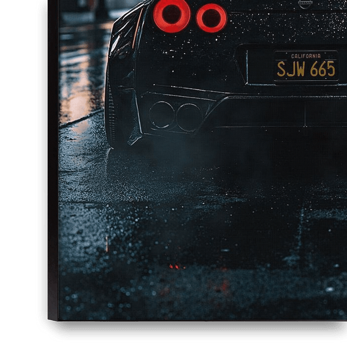 Dieses fesselnde Bild zeigt die Rückansicht eines schnittigen, dunkel gefärbten Nissan GT-R Sportwagens, der auf einer nassen, nächtlichen Straße geparkt ist. Der Regen glitzert sichtbar auf der Oberfläche des Wagens, und ein leichter Nebel oder Dampf steigt vom Boden auf, was die atmosphärische Stimmung noch verstärkt. Die kreisrunden…