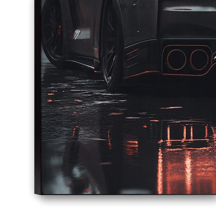 Eine Nahaufnahme der kultigen runden Rücklichter eines Nissan GT-R R35 in einer regnerischen Nacht. Die nasse Straße reflektiert das rote Leuchten und fängt eine intensive, urbane Straßenrennatmosphäre mit einem 'HOOLIGAN' Kennzeichen ein.