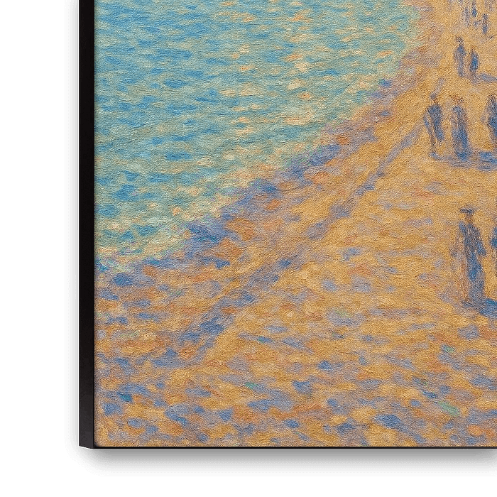 In der Komposition halten sich Bewegung und Ruhe die Waage: flanierende Figuren werfen langgezogene Schatten, die Küstenlinie wölbt sich anmutig dem Horizont entgegen, und der Himmel leuchtet in sanften Blau- und Pfirsichtönen. Diese subtilen Elemente schaffen eine einladende Atmosphäre, die sich perfekt für Wohn- und Schlafzimmer, Häuser an der Küste, Boutique-Hotels oder kreative Arbeitsbereiche eignet, die einen entspannenden und zugleich ermutigenden Blickfang suchen.