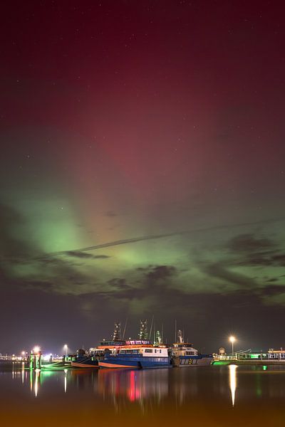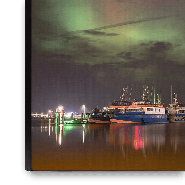 Nordlicht im Hafen von Lauwersoog mit Crew-Tendern von Seazip am Steg. Mit Spiegelung im Wasser. 19-01-2026
