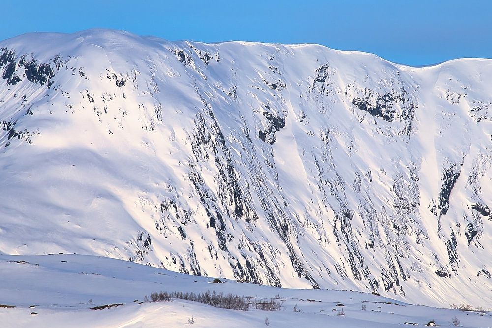 Norwegisches Hochgebirge, verschneit Berge und Landschaft. Winterliche Landschaft mit viel Weite.