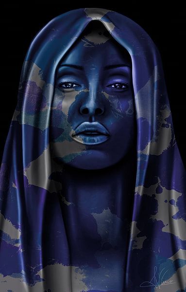 Nr. 55 ist ein digitales Kunstwerk, das auf Illustration basiert. Dieses Werk passt gut in Räume mit einer 'hotel chic' Atmosphäre. Diese bedeckte, dunkle Frau mit blauen Schattierungen blickt mit entschlossenem Blick in die Welt hinaus.