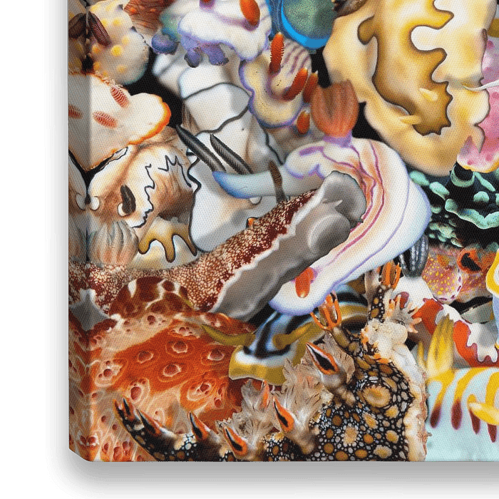 Collage aus etwa 90 verschiedenen Schnecken. Nackte Schnecken sind Schnecken, die unter Wasser leben. Es gibt Hunderte von verschiedenen mit unterschiedlichen Formen und einer Variation des gesamten Farbprismas.