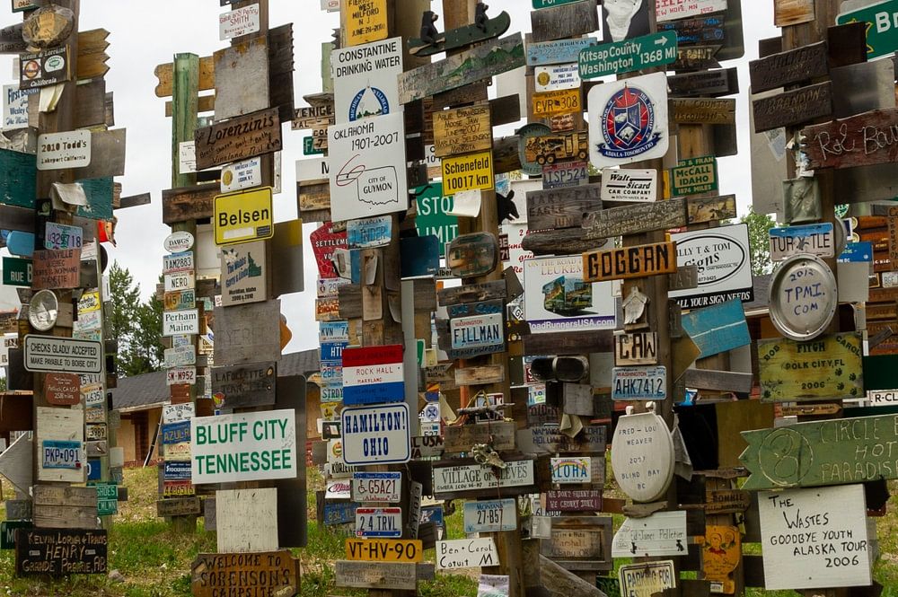 In Watson Lake Canada befindet sich der Place Sign Forest, ein verrückter Wald aus Ortsschildern und Namen von Menschen aus aller Welt, der vor 45 Jahren von einem Menschen mit Heimweh ins Leben gerufen wurde. Er nagelte den Namen seiner Heimatstadt an einen Baum und schuf so ein Meer aus Pfählen und Bäumen, zwischen denen man umherwandern konnte. Sie enthält auch niederländische Ortsnamen wie Katwijk, Gorssel und Groenlo.
