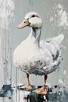 Dieses ausdrucksstarke Kunstwerk stellt eine Ente auf abstrakte und dynamische Weise dar. Die dicken Pinselstriche und die Verwendung von Texturen verleihen der Ente eine greifbare Präsenz, als ob das Tier jeden Moment von der Leinwand heraustreten könnte. Die Verwendung weicher Weiß-, Grau- und Blautöne in Kombination mit…