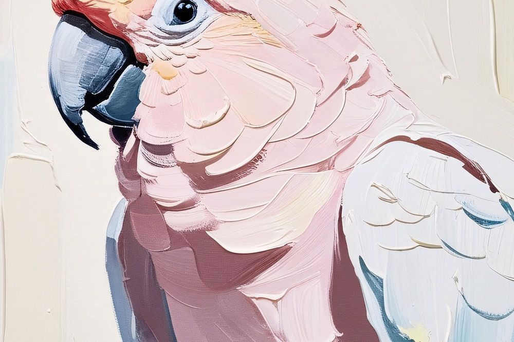 Dieses lebendige Kunstwerk zeigt einen wunderschön gemalten Kakadu in sanften Farben, darunter subtile Schattierungen von Rosa, Blau und Weiß. Die dicken Ölfarbenstriche verleihen dem Vogel ein taktiles, dreidimensionales Aussehen, das sofort ins Auge sticht. Das minimalistische Design des Hintergrunds sorgt dafür, dass die Aufmerksamkeit ganz auf den eleganten Vogel gerichtet bleibt. Dieses Kunstwerk wäre eine großartige Ergänzung in modernen Innenräumen, insbesondere in ruhigen Räumen wie einem Schlafzimmer oder einem Büro, wo der subtile Einsatz von Farbe und der ruhige Look für Ruhe und Ausgeglichenheit sorgen. Dieses Gemälde ist perfekt für Fans von Vögeln oder abstrakter Kunst und verbindet Natur und Kunst auf beeindruckende Weise.