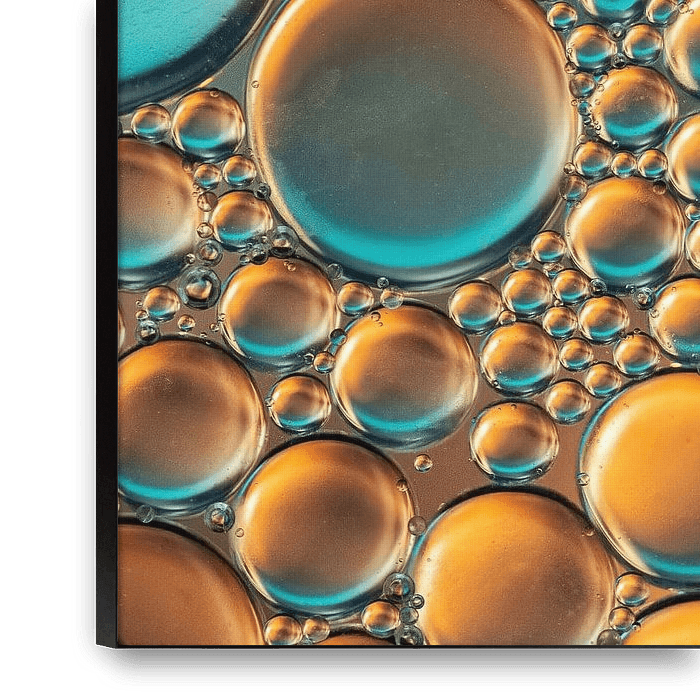 Bestelle dieses abstrakte Wandbild Öltropfen aus Gold und Benzin auf Wasser von Lucille Advocaat als Reproduktion auf Leinwand, Alu-Dibond, als Poster, Fototapete oder Acrylglasbild.