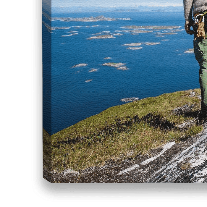 Auf dem Gipfel des Berges Sørsanna des Schärengartens Træna, während des norwegischen Festivals. Nach einer beachtlichen Bergbesteigung eine schöne Aussicht über die Inseln und das blaue norwegische Meer.