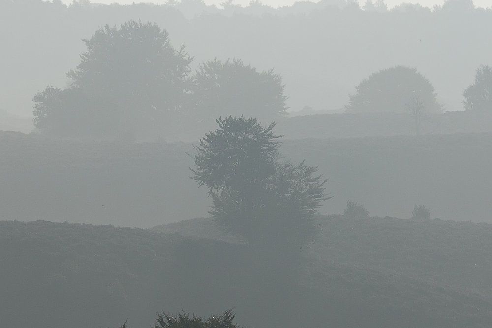 Ochtendnevel zorgde voor een prachtige dieptewerking van de heuvels van de Posbank bij Rheden.