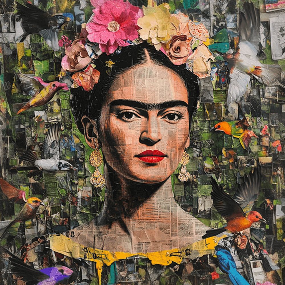 “Ichiwarashi” is een kunstwerk dat diep geworteld is in de geest van Frida en dat meteen de aandacht trekt met zijn rijke details en krachtige uitstraling. In het midden staat een majestueus portret, duidelijk geïnspireerd door Kahlo’s iconische zelfportretten, omringd door een weelderige collage van bloemen, exotische vogels, en weelderige vegetatie. Elk detail in deze compositie, van de zachte veren van een tropische vogel tot de levendige kleuren van de bloemen, is met grote zorg geselecteerd en samengevoegd. De verborgen lagen in de achtergrond onthullen zich langzaam, als een eerbetoon aan de diepgaande symboliek die Kahlo zo meesterlijk beheerste.