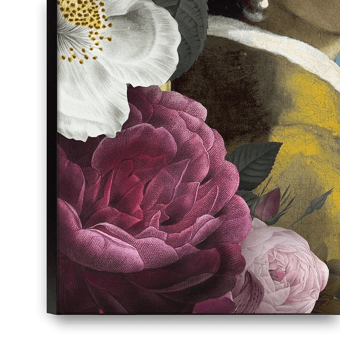 Collage mit schönen bemalten Rosen und dem von Johannes Vermeer 1665-1667 gemalten "Mädchen mit Perlenohrring".
