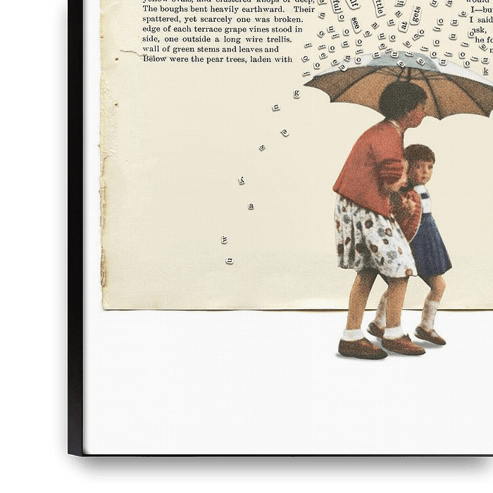 "Oh no, it's raining again..." ist eine meiner Collagearbeiten, in der ich immer denselben Text verwendet habe. Eigentlich ist der Text nicht wichtig, sondern das, was mit diesem Text passiert. In diesem Fall fallen Sätze, Wörter oder Buchstaben wie Regentropfen auf ein ausgeschnittenes Bild von zwei Kindern mit einem…