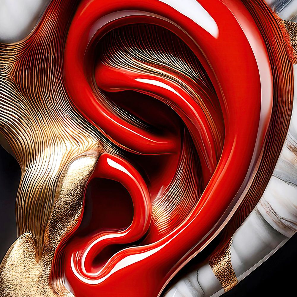 In diesem skulpturalen Werk wird das menschliche Ohr zum ästhetischen und symbolischen Zentrum einer raffiniert komponierten Inszenierung. Dreidimensional ausgeformt, erhebt sich das Ohr aus edelsten Materialien: weißem Marmor von klassischer Reinheit, glänzendem Rot von sinnlicher Intensität und schimmerndem Gold als Zeichen von Wert und Veredelung. Die Kombination dieser Werkstoffe lässt die Skulptur zugleich organisch und entrückt erscheinen – ein Objekt zwischen Naturabbildung und künstlerischer Transformation.