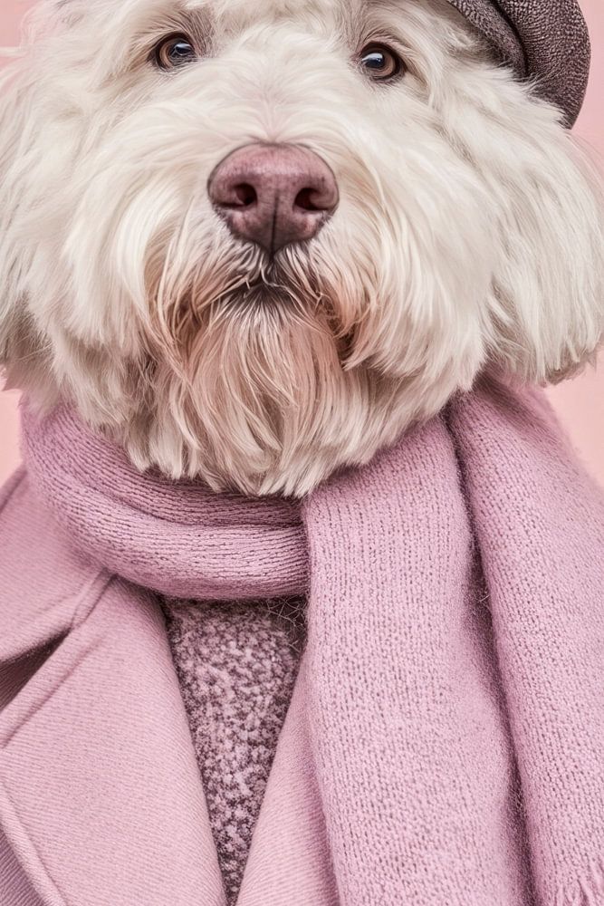 Mit seiner charmanten Mütze und dem elegant drapierten Schal strahlt dieser Old English Sheepdog eine wunderbare Mischung aus Stil und Persönlichkeit aus. Sein flauschiges, weißes Fell umrahmt ein freundliches Gesicht, das Neugier und Lebensfreude ausstrahlt. In sanften Rosatönen posiert er spielerisch und verkörpert den perfekten Modebewussten unter den vierpfotigen Freunden.