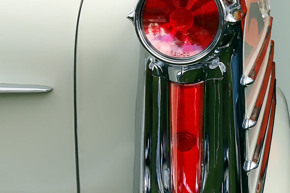 Das elegante perlweiße Finish harmoniert perfekt mit den glänzenden Chromdetails und dem leuchtend roten Rücklicht, das wie ein Juwel in der skulpturalen Heckflosse eingebettet ist. Das markante Oldsmobile-Emblem mit seinem sternenförmigen Design unterstreicht die Premiumqualität dieser legendären Marke. Die vertikale Anordnung der Rückleuchte war revolutionär und verlieh dem Super 88 seine unverwechselbare Identität.
