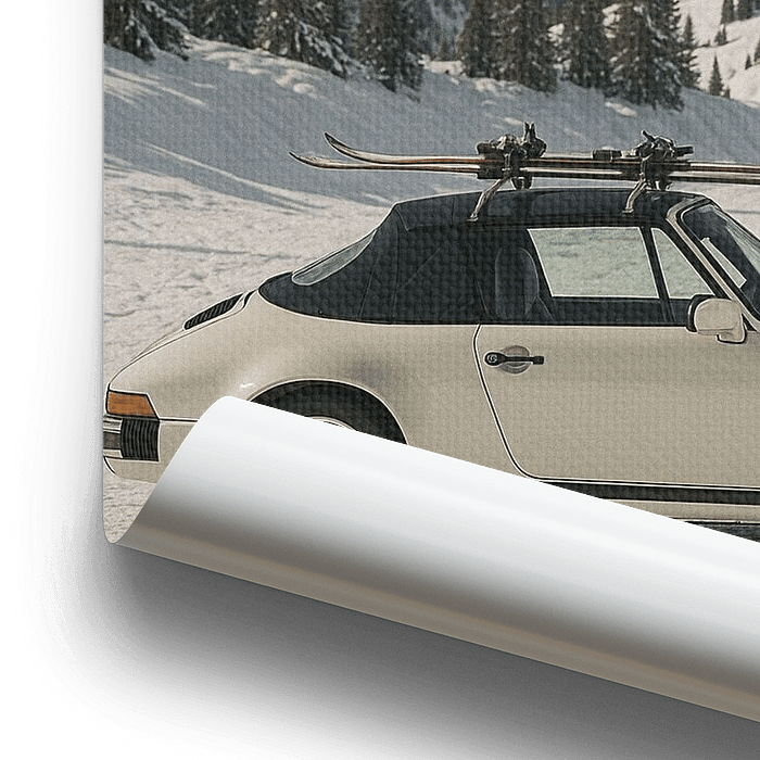 Bestelle dieses Landschafts-Wandbild Oldtimer Après Ski Alpin Winter Classic Auto von Dagmar Pels als Kunstdruck auf Leinwand, Alu-Dibond, als Poster, Fototapete oder Acrylglasbild.