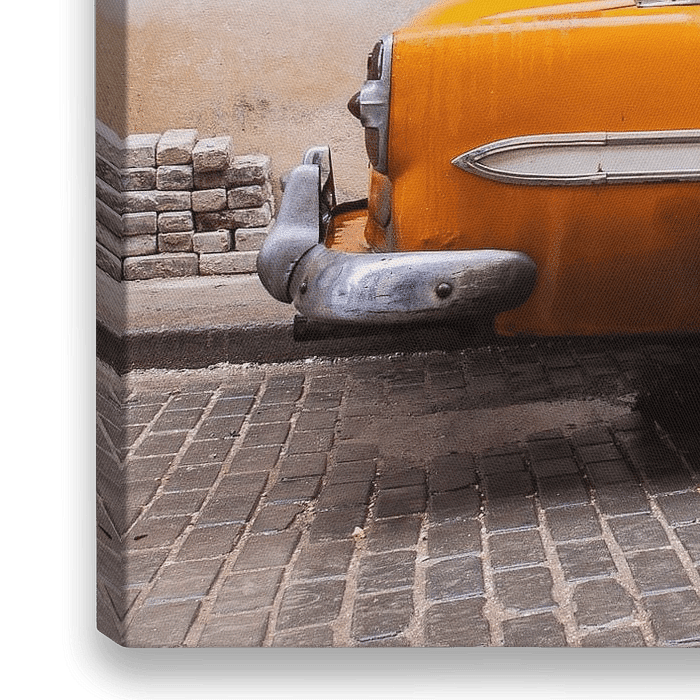 Ein klassischer orangefarbener kubanischer Oldtimer in den Straßen von Havanna. Diese Art von Oldtimern dominieren noch immer die Straßen Kubas, und Touristen werden hier oft mit der Kamera verrückt!