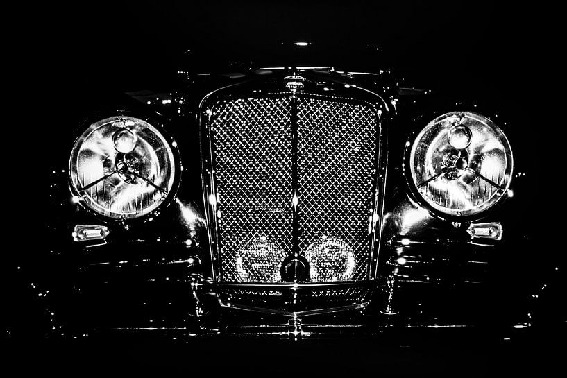 Foto eines klassischen Oldtimer Front mit Kühlergrill und Scheinwerfern beleuchtet in schwarz-weiss