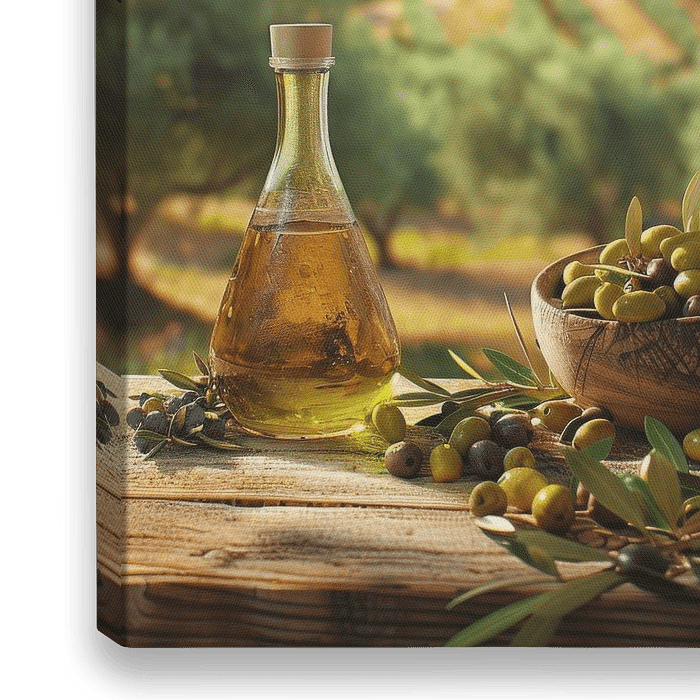Dieses farbenfrohe Stillleben fängt die Essenz des mediterranen Lebens ein. Reife Oliven und goldene Olivenölflaschen ruhen auf einem rustikalen Holztisch, umgeben von üppigen Olivenbäumen unter der warmen Sonne. Die detailreiche Darstellung und die lebendigen Farben transportieren Sie direkt in eine mediterrane Landschaft, ideal für…