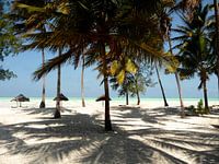 Palmbomen op het strand van Zanzibar. In de verte de turquoise zee en strakblauwe hemel.