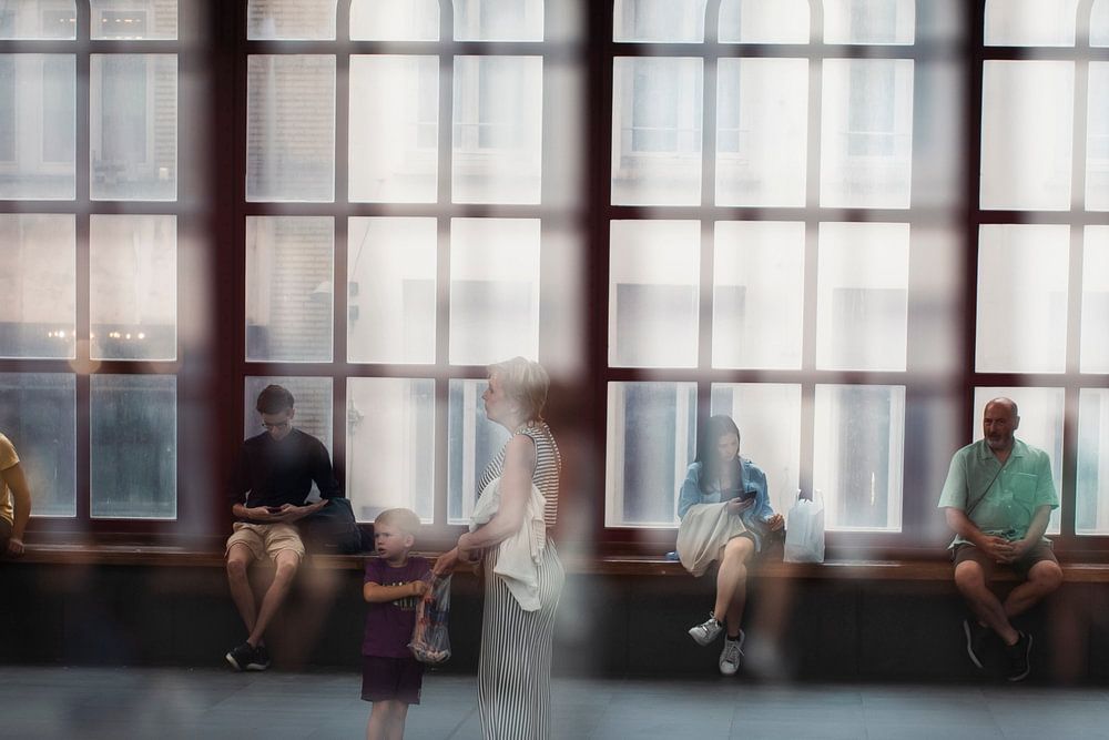 Dieses Foto, das auf dem Bahnsteig eines Bahnhofs aufgenommen wurde, zeigt, dass Menschen, die unterwegs sind, oft Individuen sind, wenn sie mit vielen anderen Menschen reisen. Wie selbstverständlich sitzen die Menschen in gleichem Abstand zueinander. Die Einzigen, die gemeinsam zu reisen scheinen, sind wiederum eine Mutter und ein Kind, das vielleicht zum ersten Mal mit dem Zug reist und von seiner Mutter in das Zugfahren eingeweiht wird. Mit Spannung erwartet das Kind die Ankunft des Zuges. Es hält die Hand seiner Mutter, um sie später beim Einsteigen nicht zu verlieren, aber endlich in diesem Zug zu sitzen und eine schöne Reise zu haben.