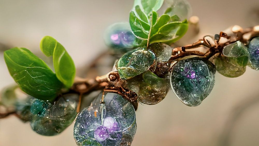 Zweige, an denen Glasperlen aus Opal wachsen.