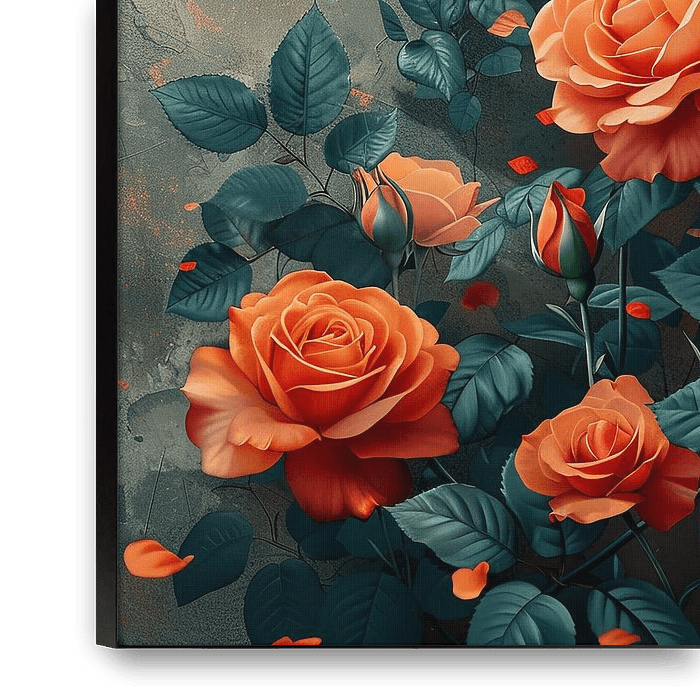 Hochauflösende Darstellung von orangefarbenen Rosen mit Blättern auf texturiertem Hintergrund, ideal für Dekor und Design.