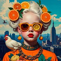 Ein surrealistisches Bild eines hübschen Mädchens mit weißblonden Haaren im Pop-Art-Stil. In ihrem Haar stecken Orangenscheiben, und im Glas ihrer Sonnenbrille liegt eine Zitronenscheibe. An ihren Ohrringen hängen kleine Orangen und auf ihrer Schulter sitzt ein Huhn. Ihre orangefarbene Kleidung mit Blumenmuster und die Perlenkette, die…