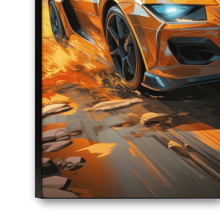 Ein aggressiver orangefarbener Sportwagen wird mitten in einer rauen, sonnenüberfluteten Wüstenschlucht eingefangen. Der Kunststil ist kühn und dynamisch und betont die Geschwindigkeit und das raue Terrain.