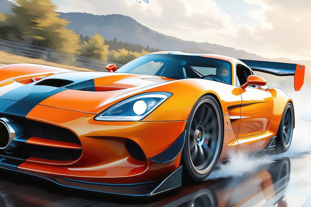 Orangefarbener Sportwagen, der auf einer nassen Rennstrecke mit Bewegungsunschärfe fährt