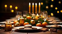 Ein traditioneller Weihnachtstisch breitet in einer intimen Nahaufnahme seine heimelige Fülle aus: Ein rustikaler Holztisch bildet die warme Grundlage, auf dem Kerzen in unterschiedlichen Höhen flackernd thronen. Das Kerzenlicht wirft ein weiches, goldenes Leuchten über die Szene und zeichnet sanfte Schatten in die Maserung des Holzes.…