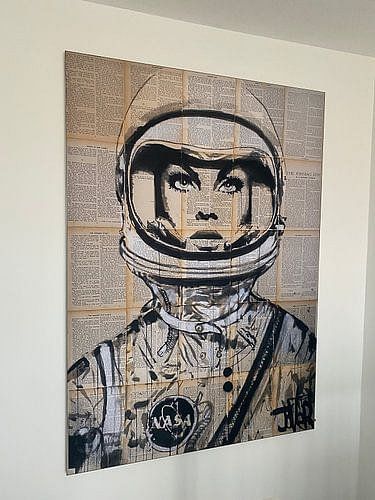 Dieses Werk ist Teil der Space-Serie von Bildern mit starken Frauen, die mit Tinte und Gouache auf alten Buchseiten geschaffen wurden.