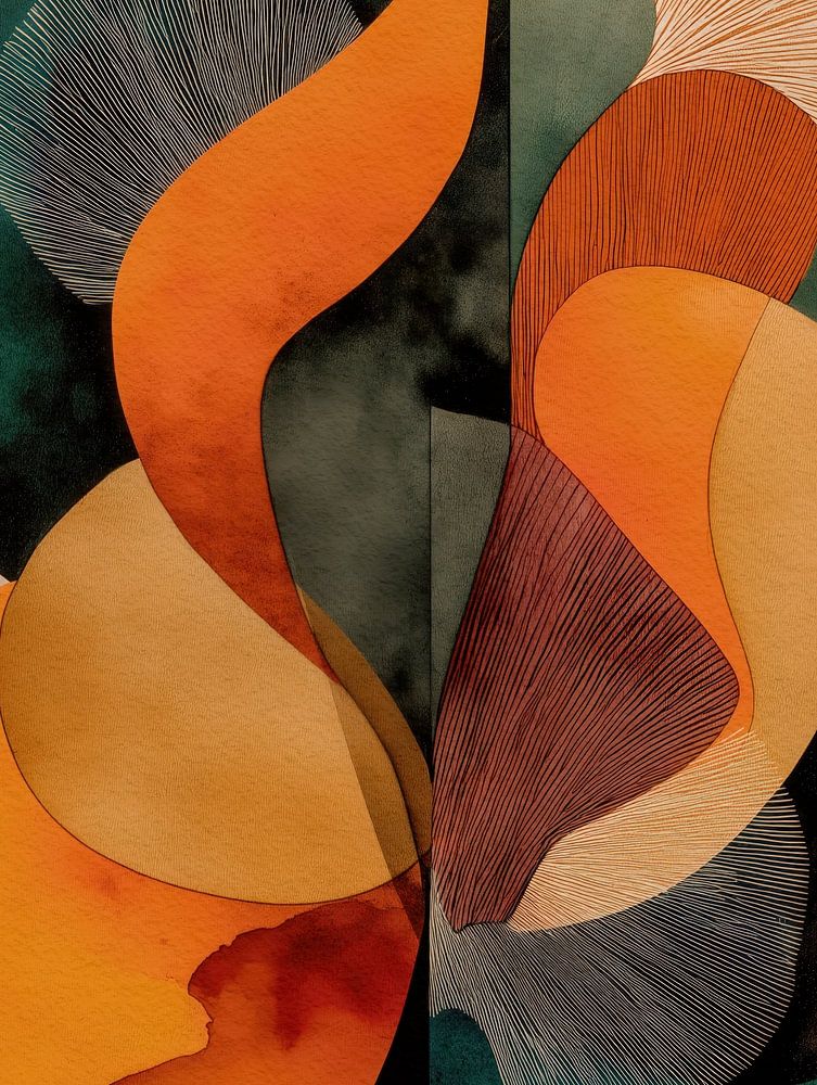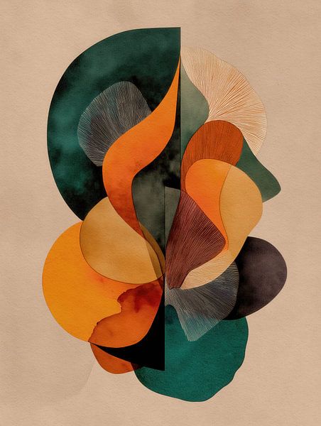 Fließende abstrakte Formen überlagern sich in gedeckten Orange- und Grüntönen und natürlichen Texturen und vermitteln ein Gefühl von Ausgewogenheit, Rhythmus und ruhiger Raffinesse.