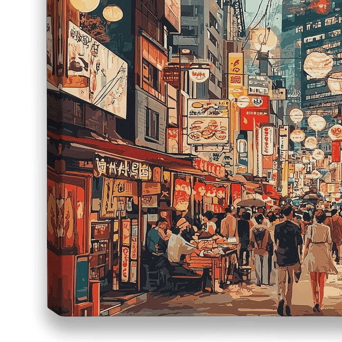 Dieses Kunstwerk ist eine Darstellung der japanischen Stadt Osaka mit ihrem geschäftigen Treiben. Zu sehen ist der Tsutenkaku-Turm, ein Wahrzeichen von Osaka.