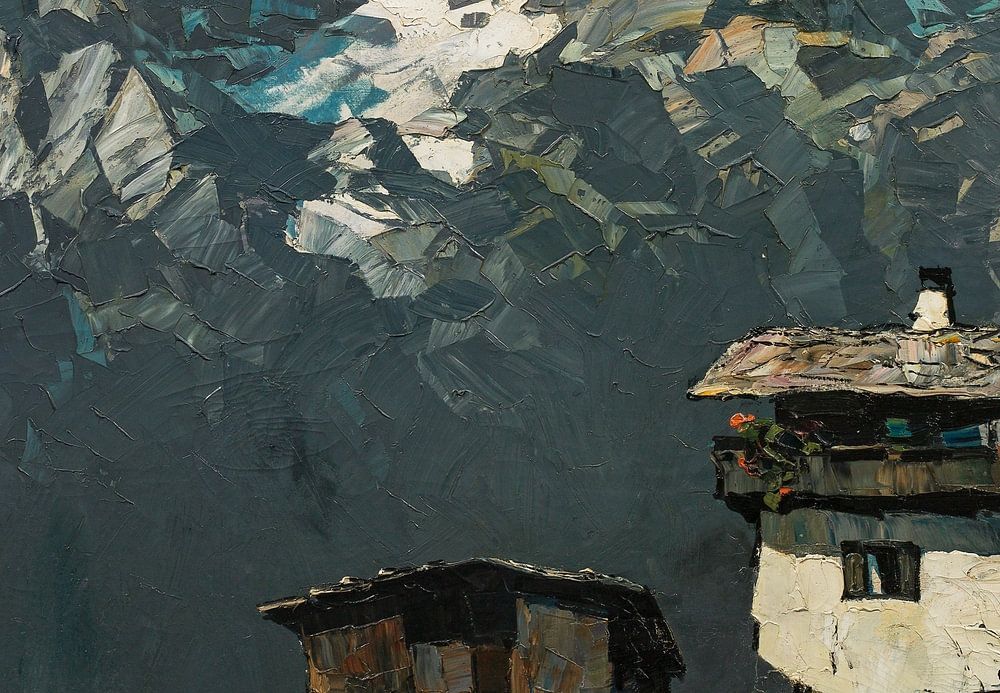 Bauernhäuser und andere Gebäude auf einem Berg in den Alpen sind die Spezialität dieses Malers. Ein Haus oder ein anderes Gebäude aus braunem Holz vor schneebedeckten Berggipfeln ist meist das Motiv.