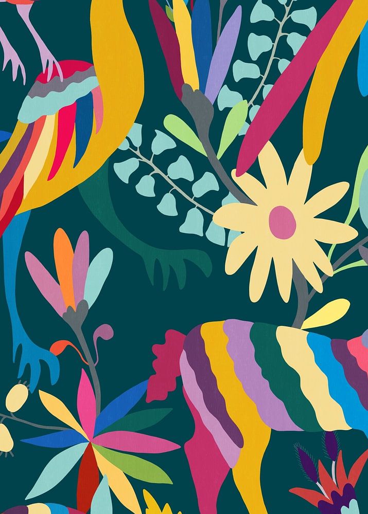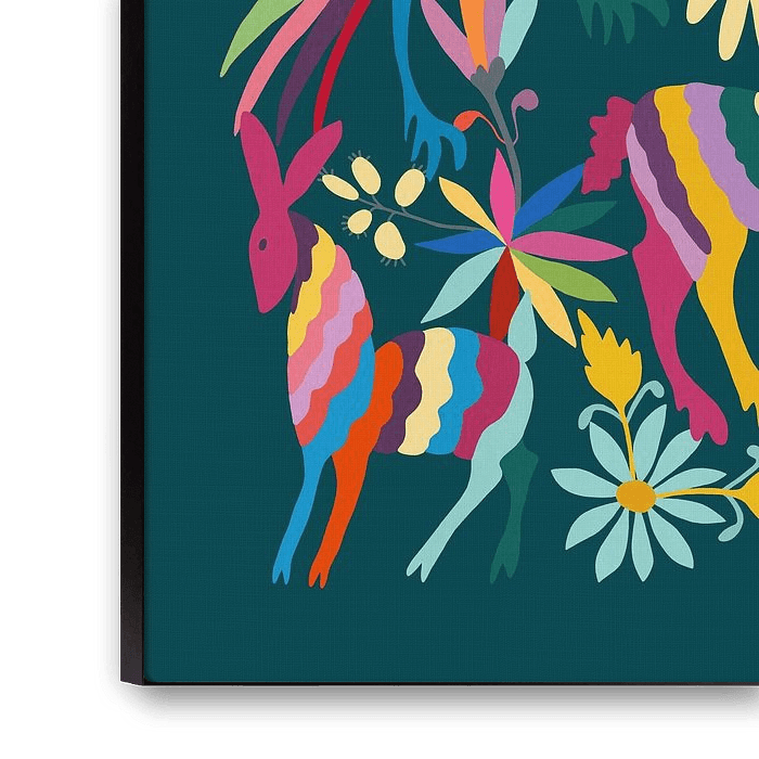 Lebendiges Otomi-Kunstwerk mit aufwendigen floralen und tierischen Motiven vor einem üppig grünen Hintergrund, das die Essenz von Natur und Kultur in einer harmonischen Verbindung traditionellen Designs einfängt