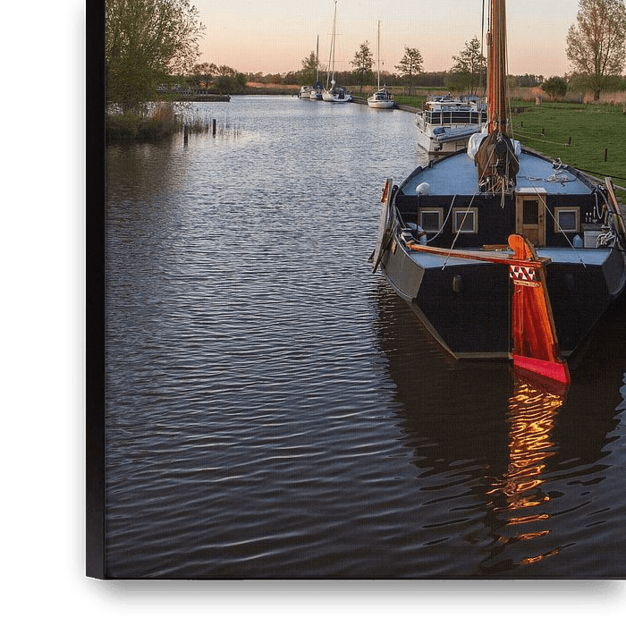 oude zeilboot bij zonsondergang gemeerd op de Friese meren