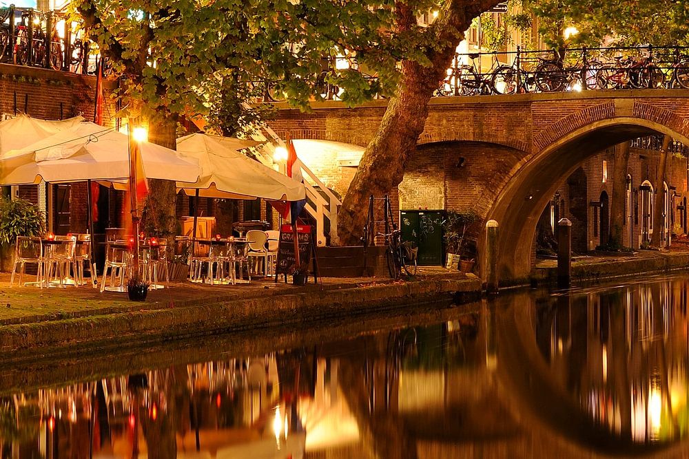 Die Oudegracht mit der Hamburger Brücke. Hinter der Hamburger Brücke sehen Sie die Gaardbrug. Die Terrasse auf der linken Seite des Hofs befindet sich im Ele Spaans Tapas Restaurant.