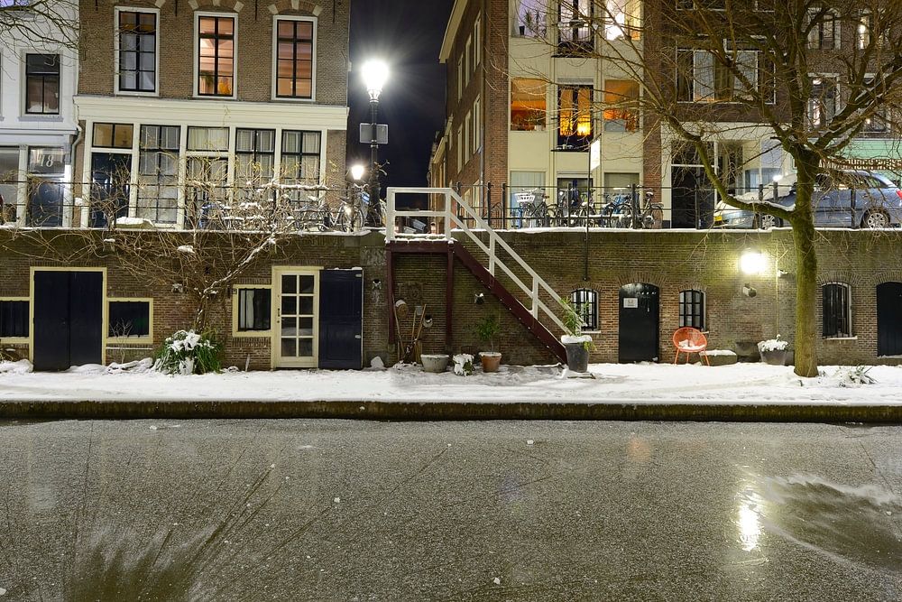 Die zugefrorene Oudegracht in Utrecht zwischen der Zand-Brücke und der Jacobi-Brücke.